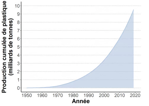 Plastique : production mondiale passée de 2 millions de tonnes par an en 1950 à 381 millions de tonnes en 2015, soit une augmentation de 18 950%.